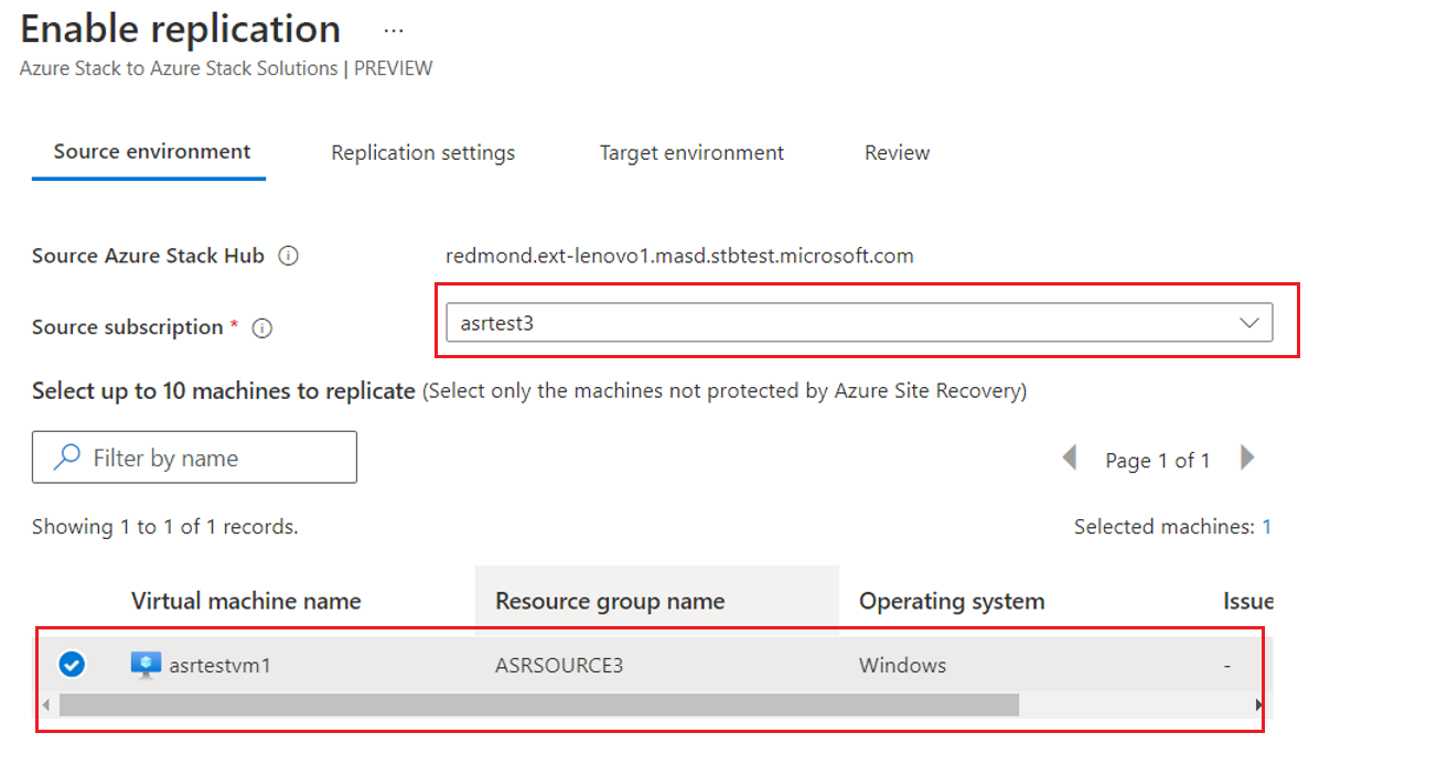 然后,边栏选项卡会要求你选择源环境和源订阅。 你应会看到配置的用户(或 SPN)有权访问的所有 Azure Stack Hub 用户订阅。