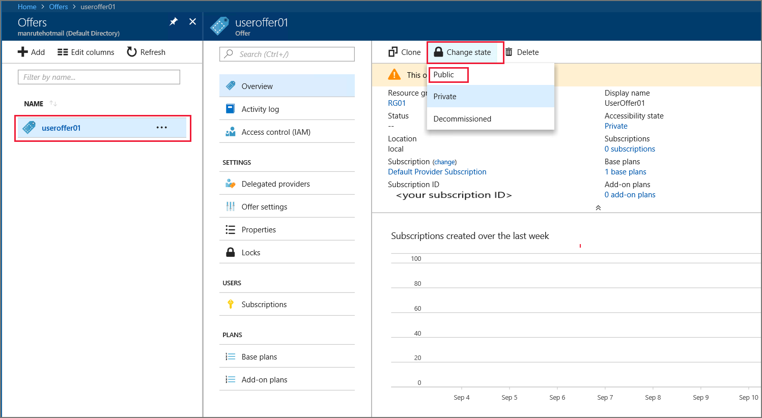 请注意横幅,其中显示套餐仍属于私人,因此用户无法订阅它。 若要将套餐更改为公开,请依次选择“更改状态”、“公开”。