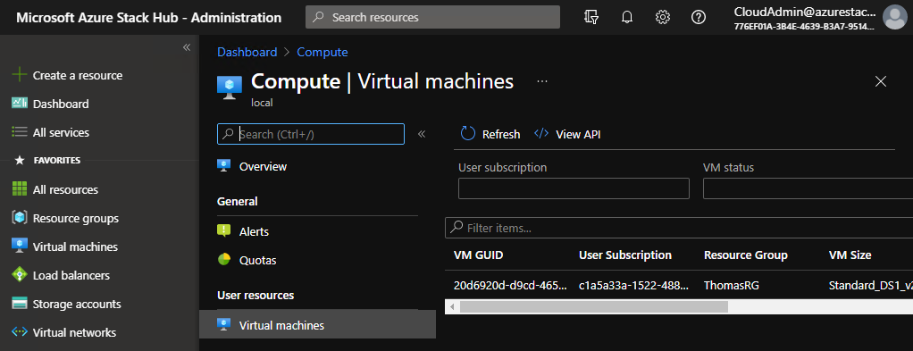 | Azure Stack Hub 门户 | 在中心菜单上,单击 “虚拟机 ”,然后从列表中选择 VM。 在 VM 的页面上,可以访问概述信息、设置值和监视指标。 |