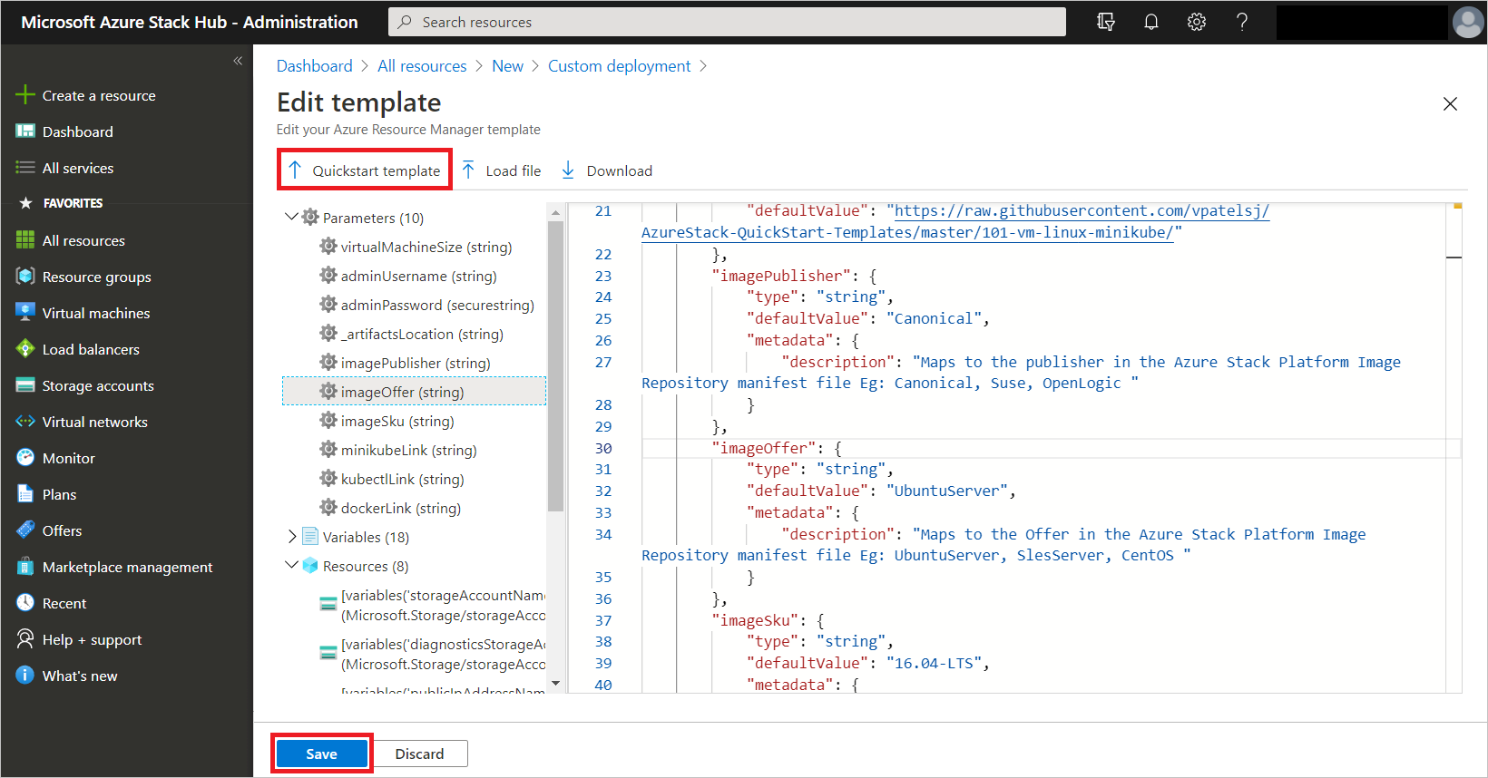 在本示例教程中,101-vm-linux-minikube Azure Stack Hub 快速启动模板用于在运行 Minikube 的 Azure Stack Hub 上部署 Ubuntu 16.04 VM 来管理 Kubernetes 群集。