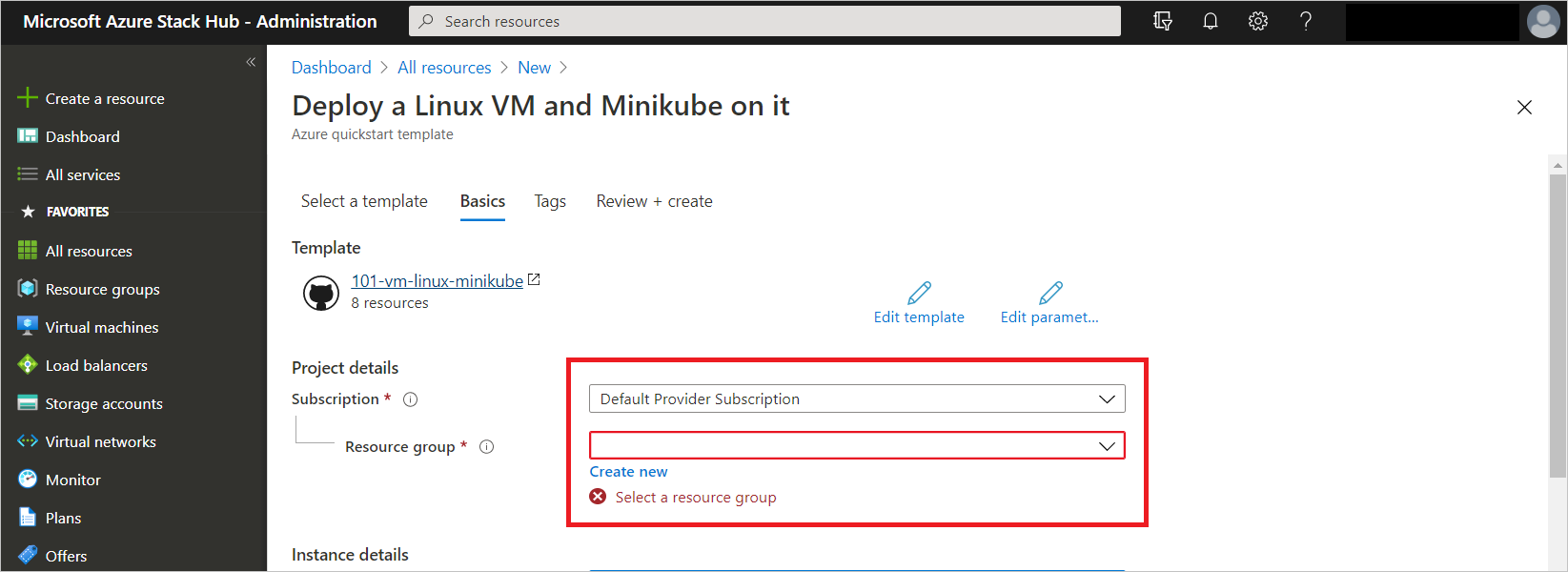 选择“快速入门模板”。 然后使用“选择模板”下拉列表从可用模板中选择“101-vm-linux-minikube”,然后单击“确定” 。
