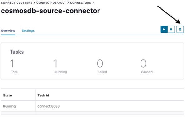 若要从 Confluent 控制中心删除连接器,请导航到创建的源连接器,然后选择 “删除” 图标。