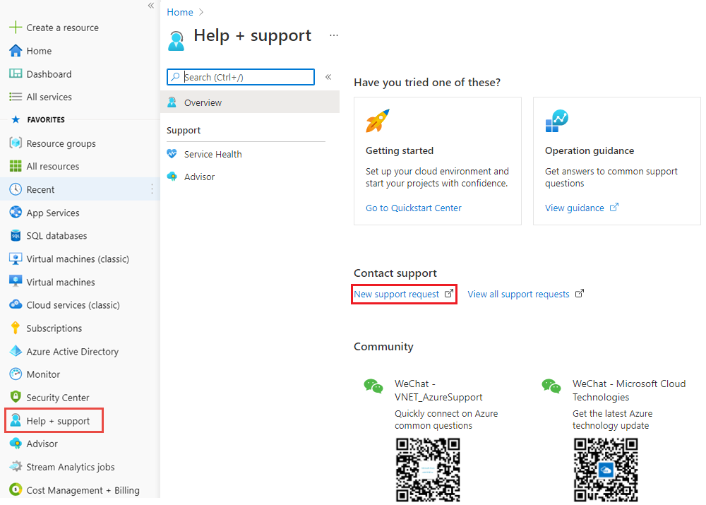 在边栏菜单中,选择 “帮助 + 支持 ”,然后选择“ 新建支持请求”。