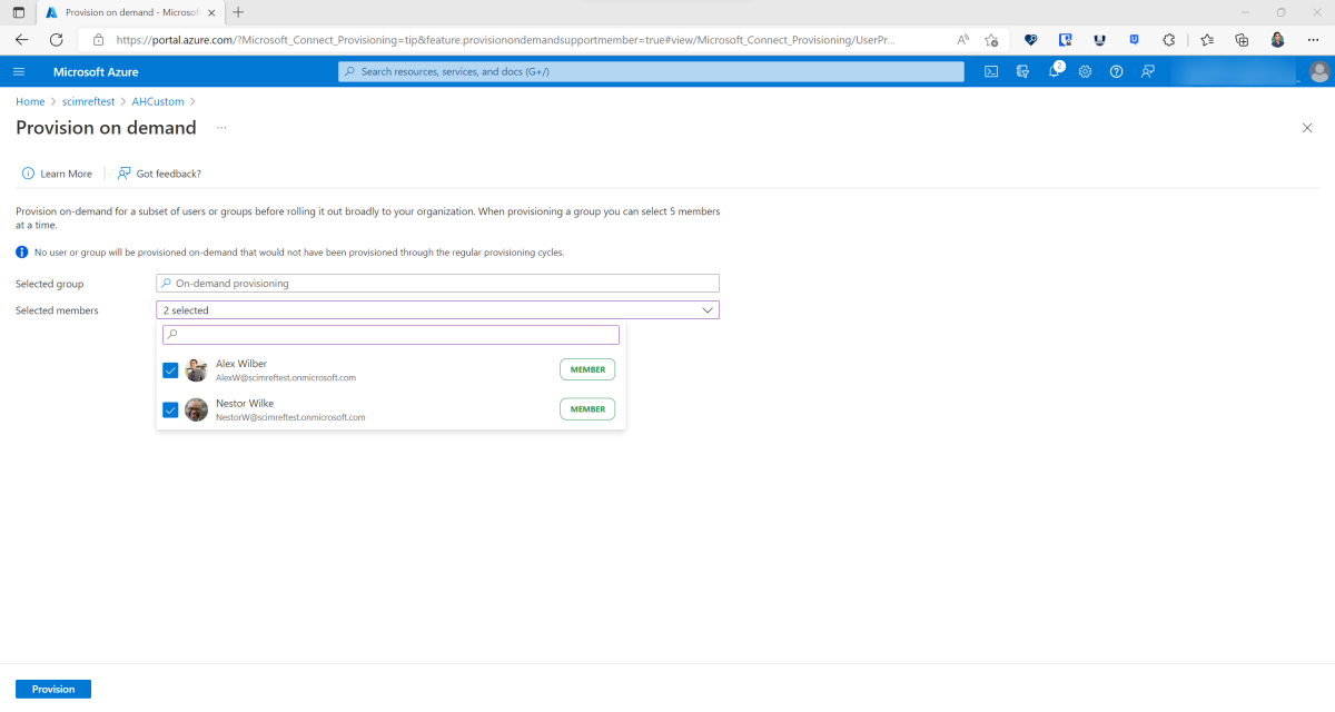 • 按需预配支持通过 Microsoft Entra 管理中心一次预配一个用户。