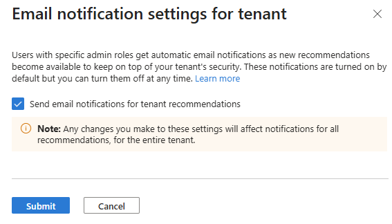 若要更新租户的 Microsoft Entra 建议电子邮件通知设置,需要具有 安全管理员 角色。