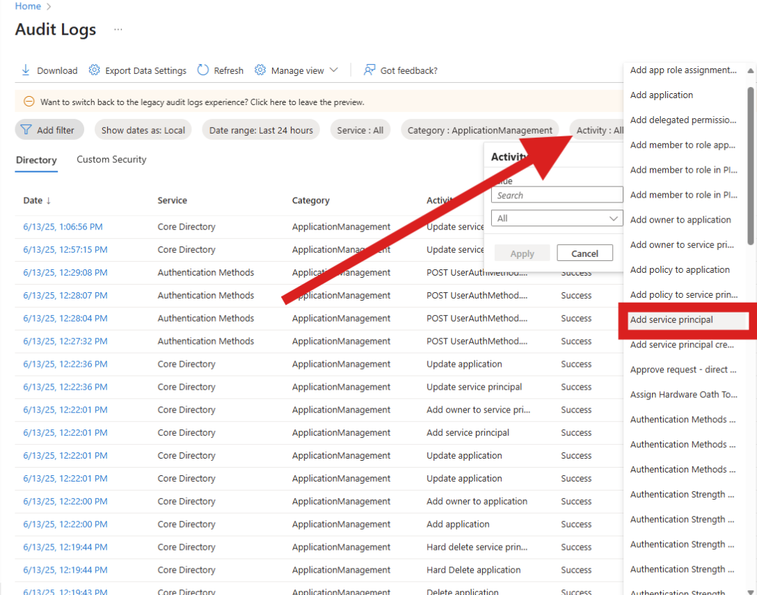 用于创建服务主体的新审核日志属性
