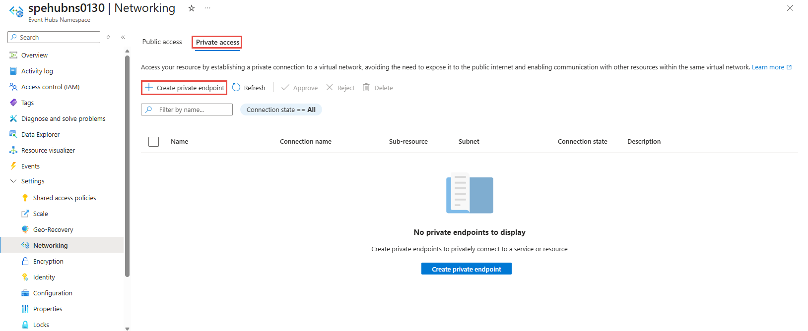 创建命名空间时,可以仅允许对该命名空间进行公共访问(从所有网络进行访问),也可以仅允许对命名空间进行专用访问(仅通过专用终结点进行访问)。
