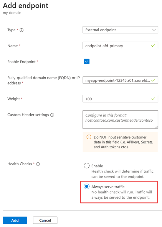 Host=$CUSTOM_DOMAIN(必需,以便 Front Door 路由到正确的自定义域)运行状况检查:始终为流量提供服务(禁用运行状况检查)