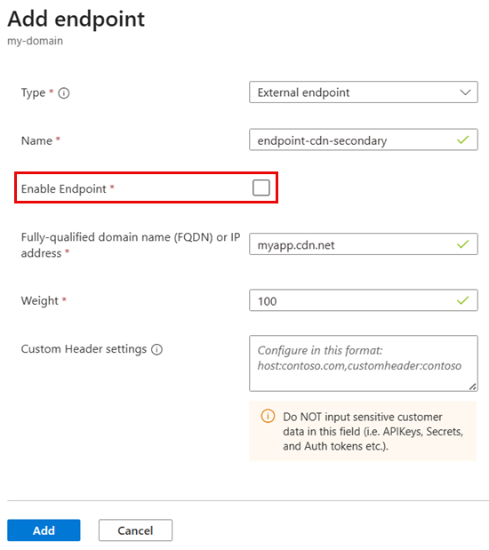 不要将主要 Azure 流量管理器配置为自动故障转移: Azure 流量管理器运行状况探测仅源自位于美国的 Azure 区域。 因此,当探测 Front Door 终结点(或使用任何广播路由的任何 CDN)时,这些基于美国的探测几乎总是会到达美国 POP,使非美国 POP 的运行状况不受验证。 这可以防止流量管理器基于任播 CDN(例如 Front Door)的真实全局健康状况,自动在 Azure Front Door 和另一个入口服务之间进行故障转移。 因此,对于需要从多个地理位置进行运行状况验证的全局工作负荷,禁用加权路由和监视的手动故障转移比自动化的基于运行状况的路由提供了更可靠的控制。