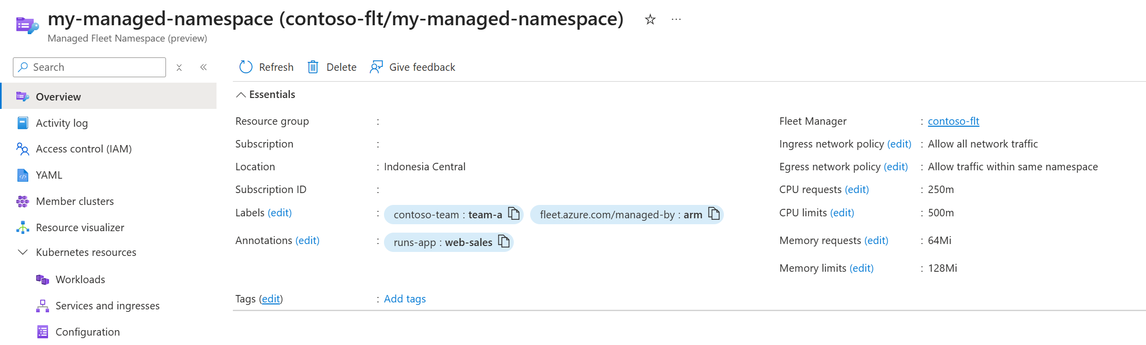通过从列表中选择命名空间,在其概览中查看托管机群命名空间的配置。