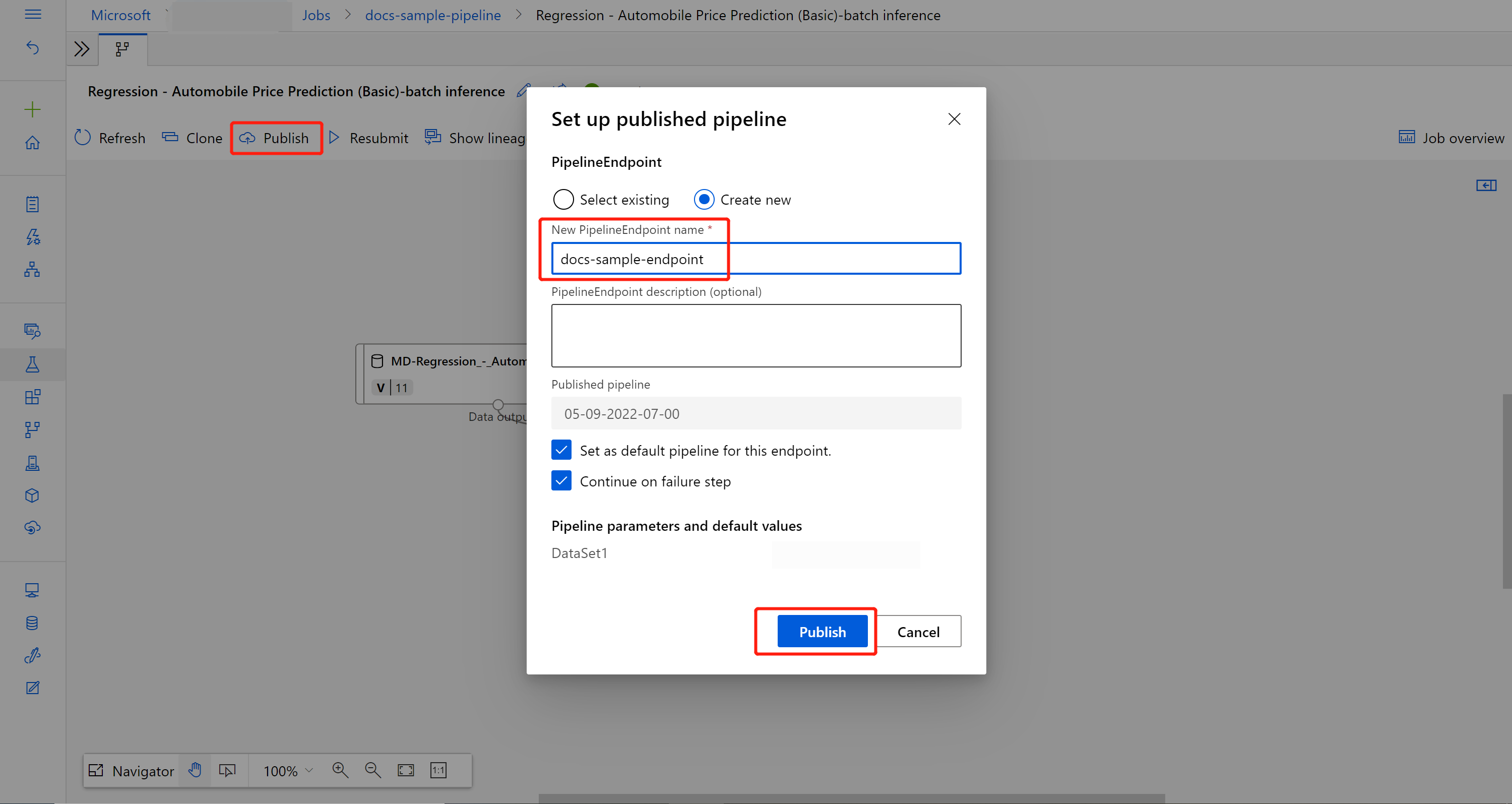 现在,你已有一个带数据集参数的已发布管道。 该管道使用在训练管道中创建的已训练模型对作为参数提供的数据集进行评分。