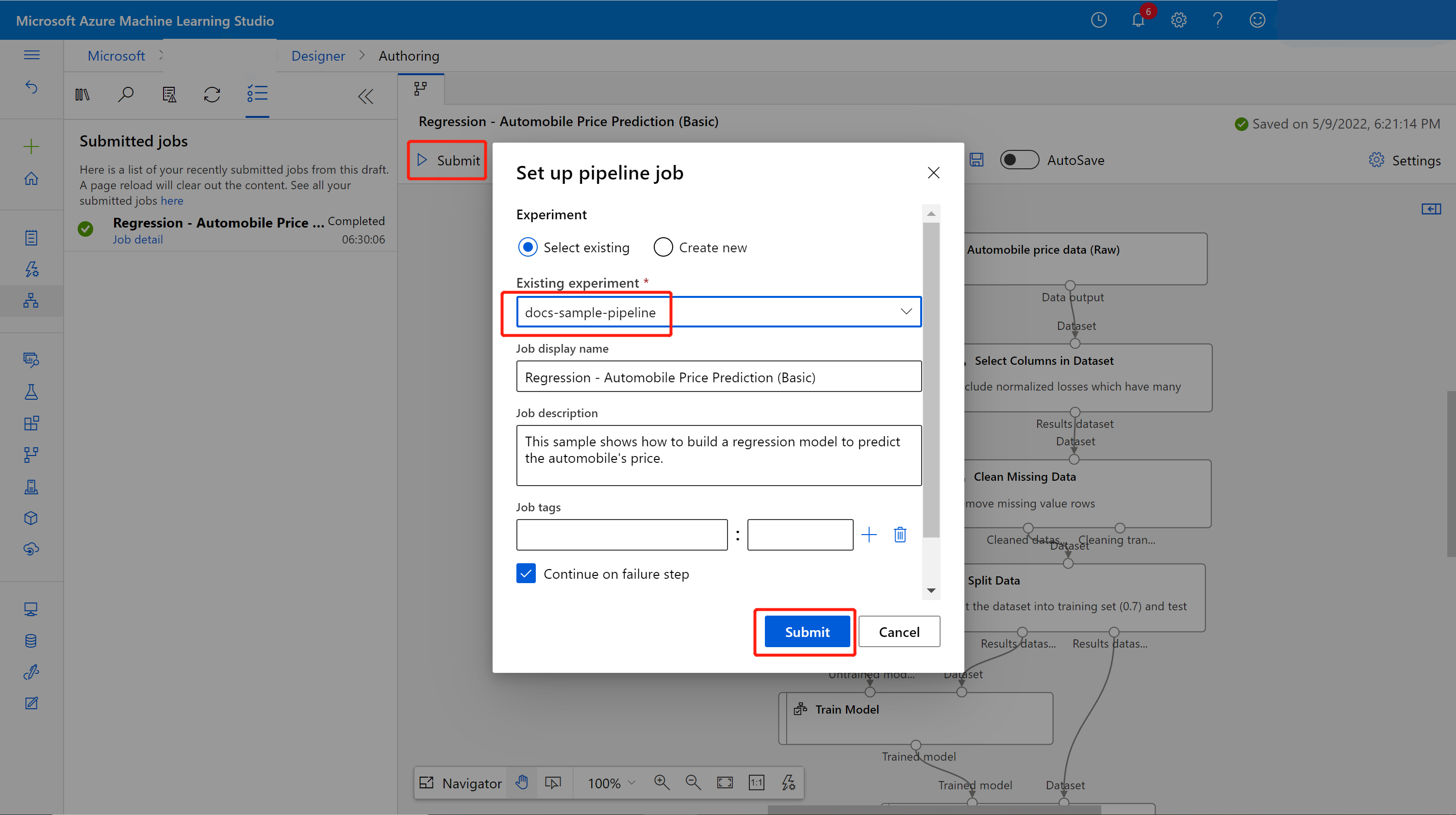 显示设置管道作业的屏幕截图,其中突出显示了试验下拉和提交按钮。