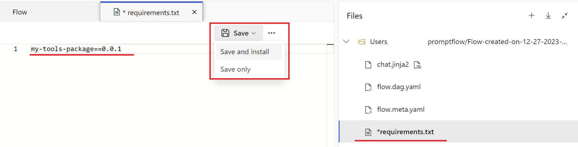 如果使用计算会话,则可通过将自定义工具包名称添加到流文件夹的 requirements.txt 文件中来轻松安装该公开发布的包。 要开始安装,请选择“保存并安装”按钮。 完成后,可以在工具列表中看到显示的自定义工具。 要了解详细信息,请参阅如何管理计算会话。