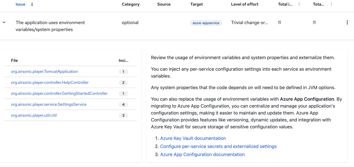 通过 appcat 执行此规则后,重新运行分析以查看生成的报告。 与其他事件一样,评估报告列出了与此规则相关的已识别问题和受影响的文件。