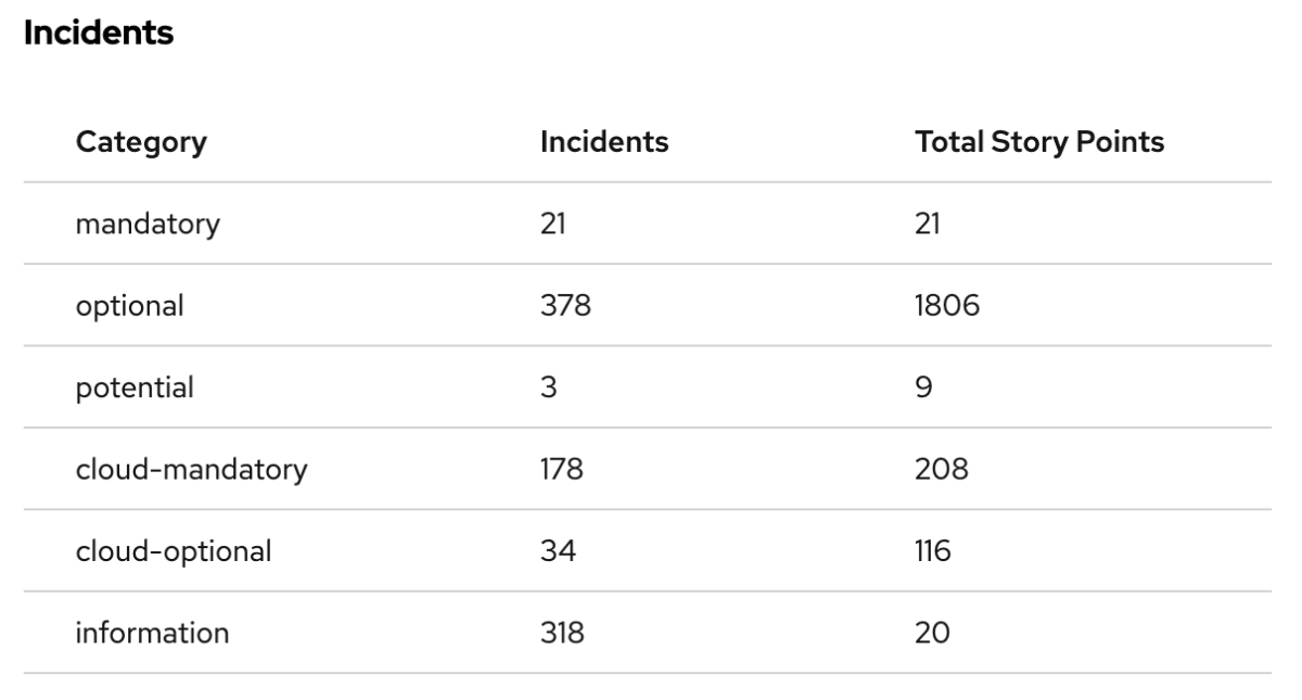 这些问题(也称为事件)具有严重性(必需、可选、潜在或信息)、工作量级别,以及指示故事点的数字。 故事点数通过计算事件数量乘以解决问题所需的工作量来确定。