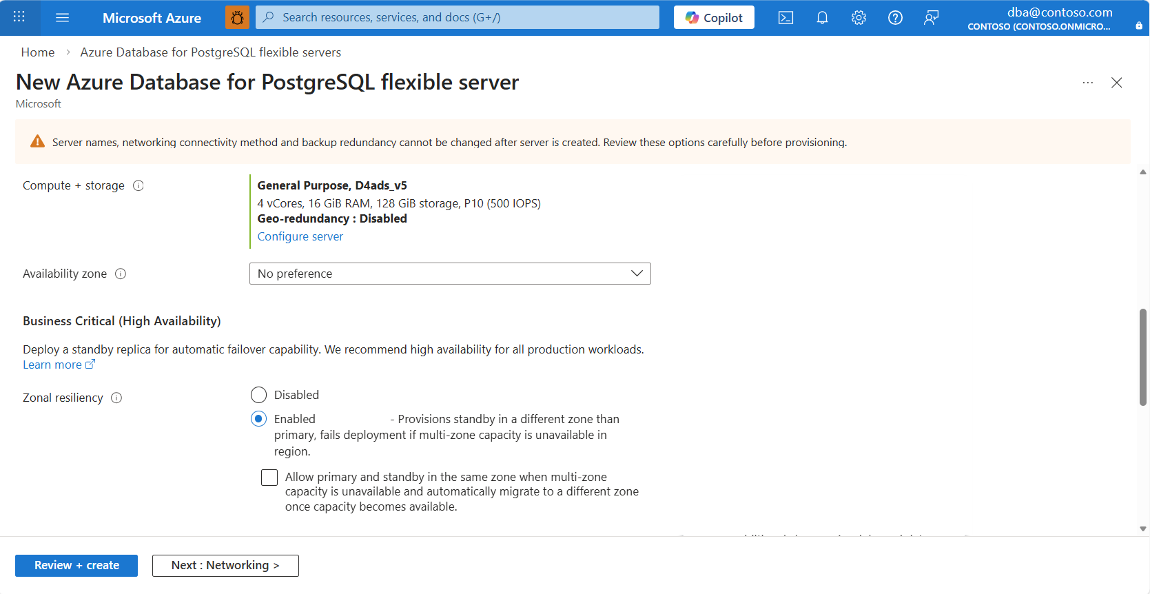 “业务关键(高可用性)”部分提供了一个选项,用于创建具有区域冗余配置的备用 HA 服务器。 为了简化配置并确保区域复原,门户提供了一个 区域复原 选项,其中包含两个单选按钮:“已启用”和“禁用”。 选择“已启用”尝试在不同的可用性区域(区域冗余 HA 模式)中创建备用服务器。 如果区域不支持区域冗余 HA,则可以选中回退复选框,以改为启用同一区域(区域性)HA。