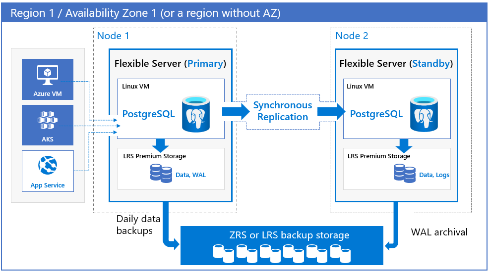 Azure Database for PostgreSQL 通过预配物理分隔的主副本和备用副本支持高可用性。 此高可用性模型旨在确保提交的数据永远不会在故障期间丢失。 在高可用性 (HA) 设置中,数据同步提交到主服务器和备用服务器。 该模型设计为数据库不会成为软件体系结构中的单一故障点。