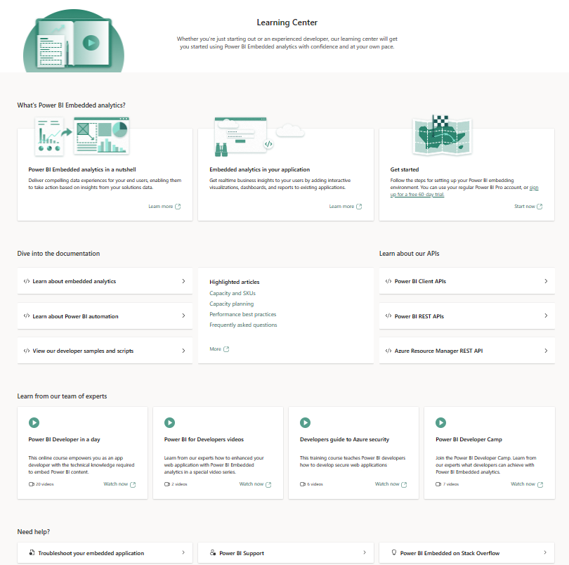 学习中心是 Power BI 嵌入式分析资源的集合。 可以在其中深入了解文档、了解 API、查找开发人员示例和视频,并了解获取帮助的位置。
