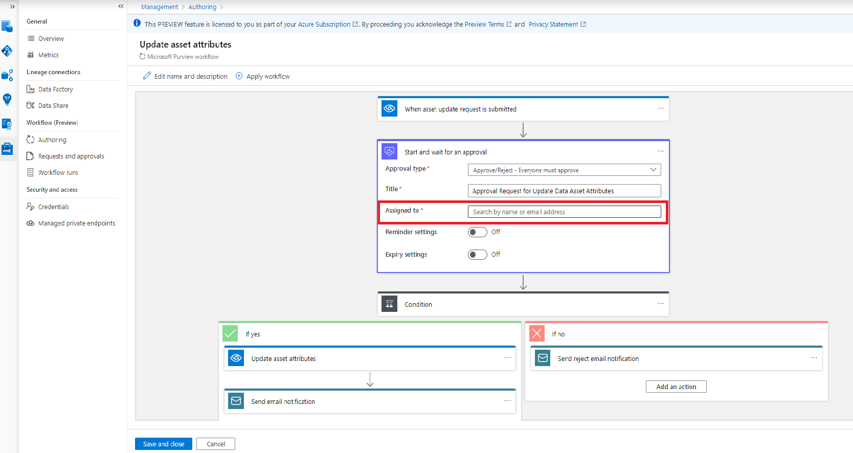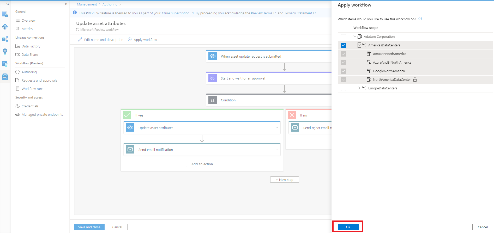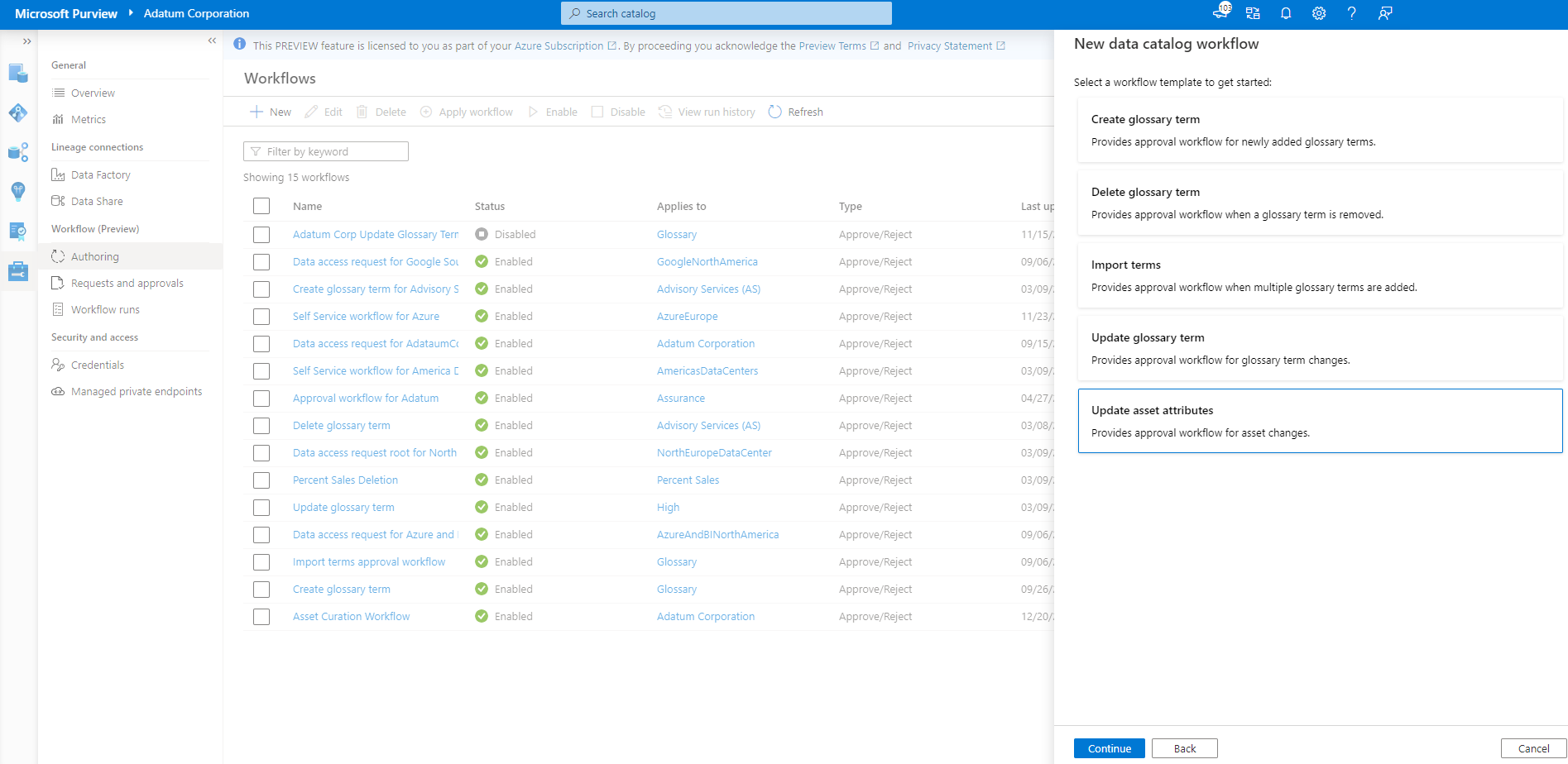 若要为资产管理创建审批工作流,请选择“数据目录然后选择”继续”