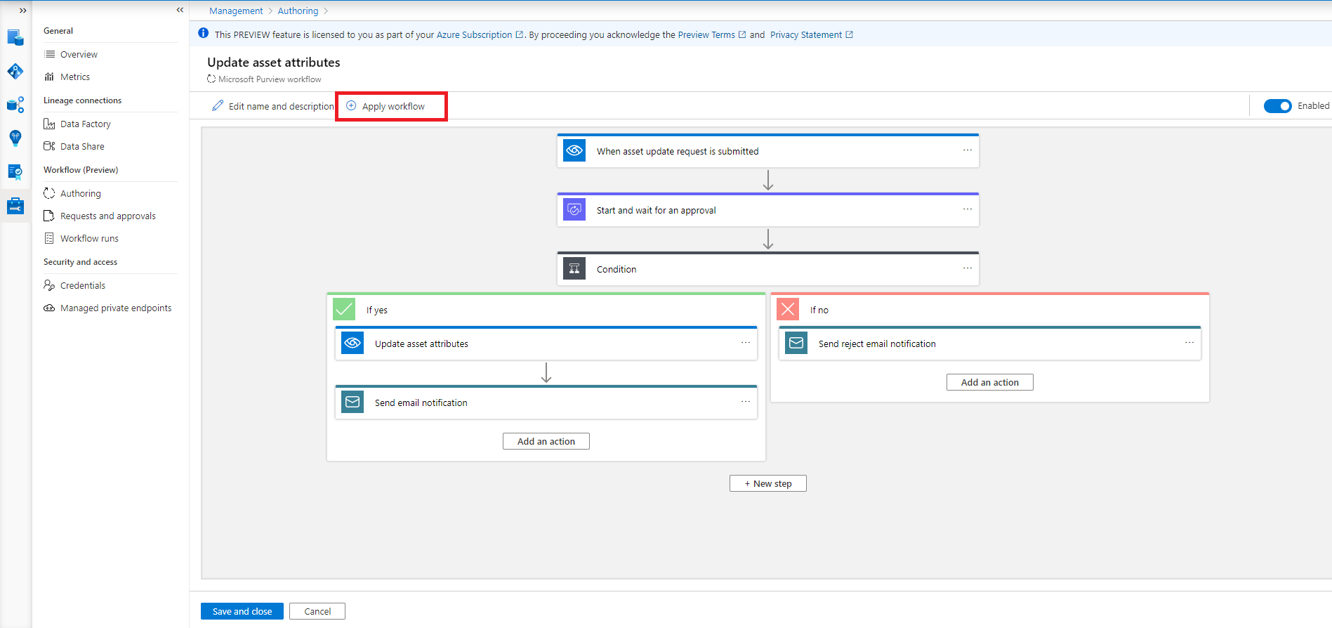 默认情况下,将启用工作流。 若要禁用,请在顶部菜单中切换“启用”按钮。