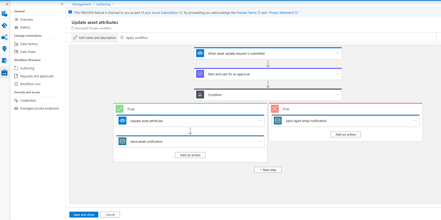 最后,选择“ 保存并关闭 ”以创建和工作流。