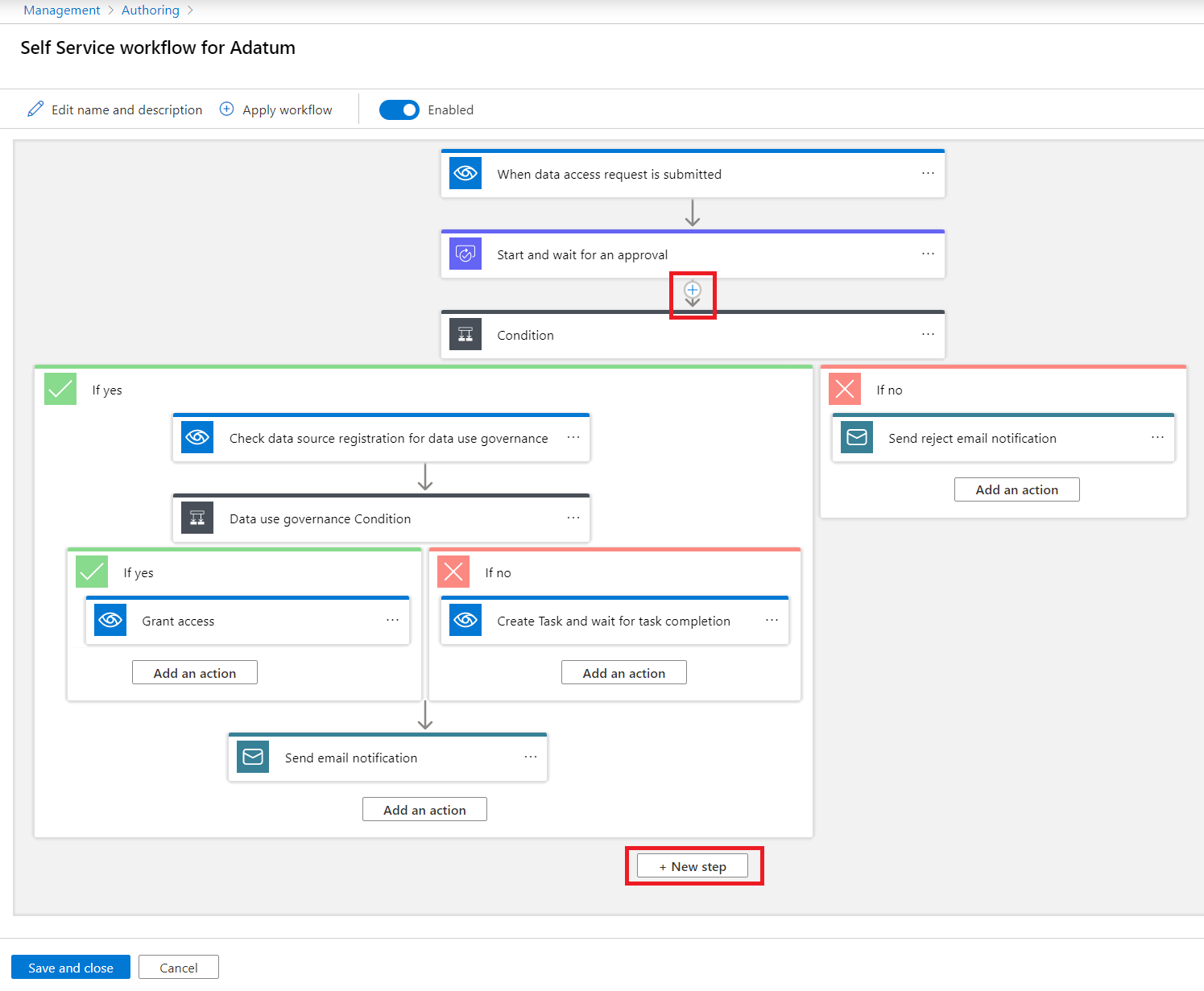 选择“ 保存并关闭 ”以创建并启用工作流。