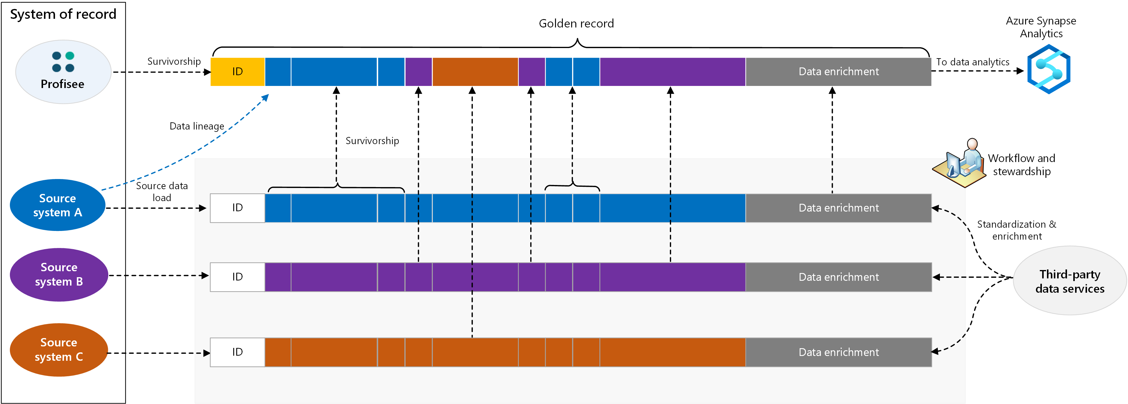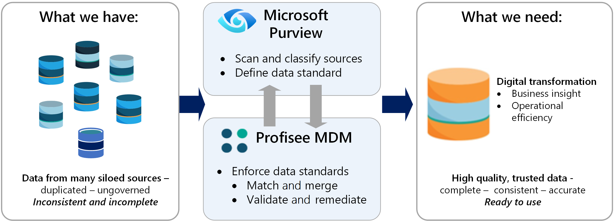 企业系统可以有多个主数据源—跨系统共享的常见数据。 编录数据源时,此事实可能会变得明显。 主数据的示例包括客户、产品、位置、资产和供应商数据。 使用 Profisee 合并、验证和更正主数据时,可以使该数据有效。 具体来说,可以使用它构建通用的受信任平台,用于分析和运营改进。 通过使用 Microsoft Purview 中详述的治理定义、见解和专业知识,可以有效地构建平台。