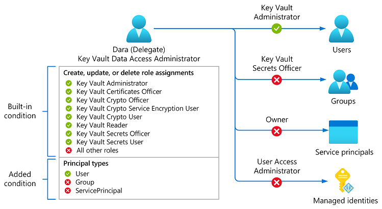 若要进一步限制“Key Vault 数据访问管理员”角色分配,可以自行添加条件来限制主体类型(用户、组或服务主体)或可以分配 Key Vault 角色的特定主体。