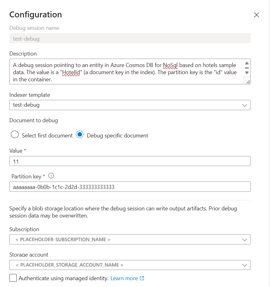 在“调试会话名称”中提供一个名称,该名称可帮助你记住调试会话所针对的技能组、索引器和数据源。