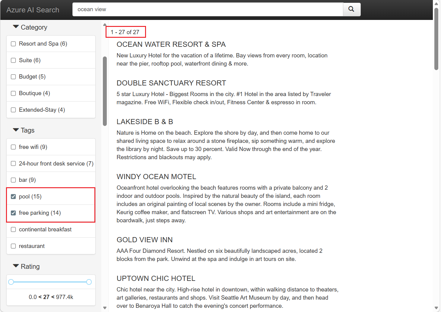 搜索服务支持过滤器和分面导航,这通常以侧边栏形式呈现。 分组基于索引架构中被标记为可筛选和可用于分组统计的字段。