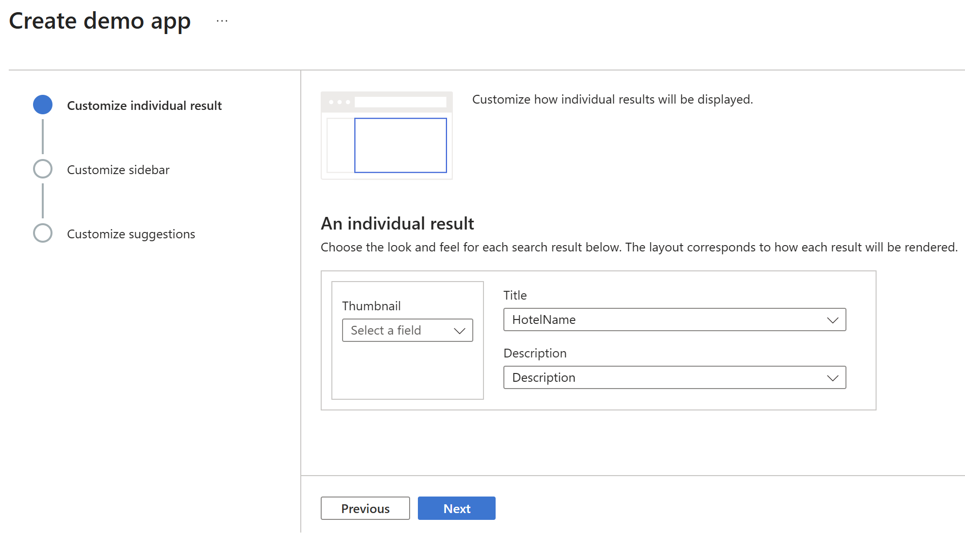 该向导为呈现的搜索结果提供基本布局,包括缩略图、标题和说明的空间。 每个元素都由索引中的字段提供支持,该字段提供所需的数据。