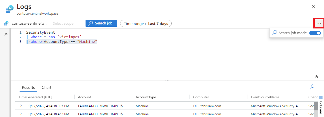 如果对查询和搜索结果预览感到满意,请选择省略号“...”并打开“搜索作业模式”。