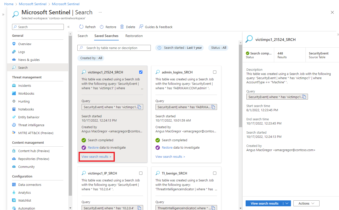从 Azure 门户转到 Microsoft Sentinel 中的“搜索”,输入搜索条件。 搜索时间根据目标数据集的大小而异。 虽然大多数搜索作业只需几分钟即可完成,但也支持对巨型数据集的搜索,这种搜索最长需要运行 24 小时。