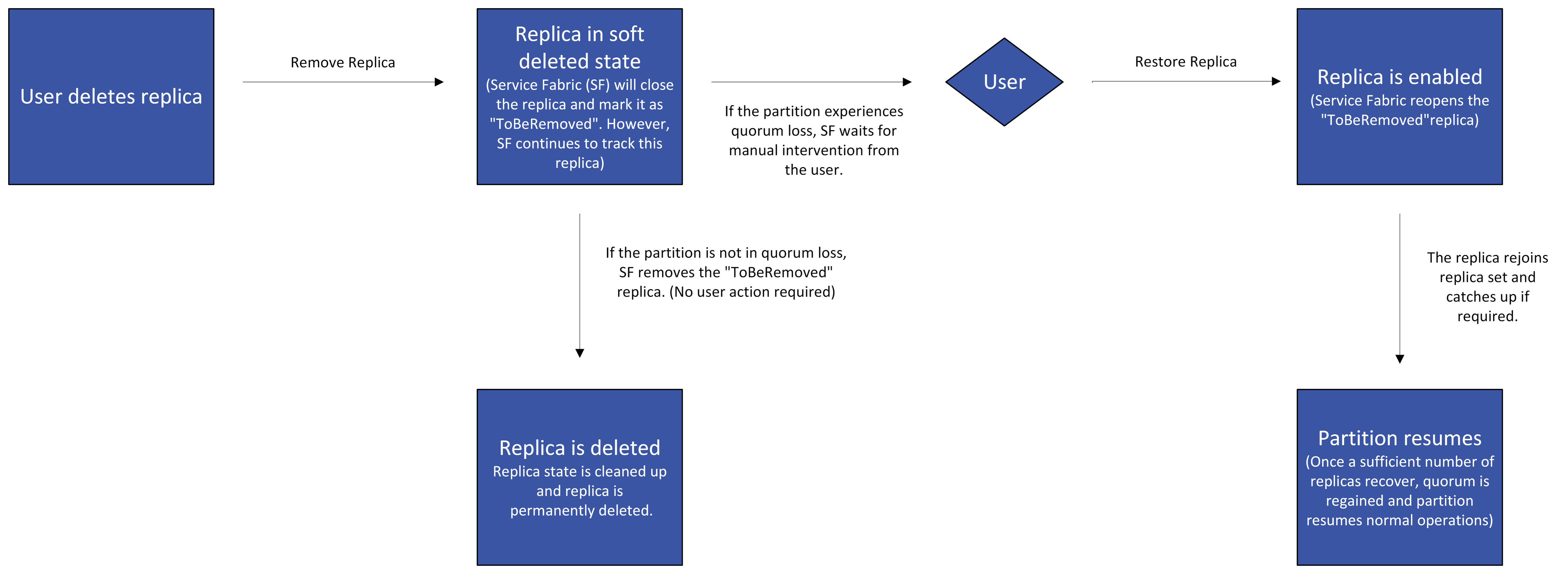 ToBeRemoved副本。 如果分区处于仲裁丢失状态,客户应使用此 API 还原所有软删除的副本。 Service Fabric 会自动确定要保留哪些副本以恢复法定人数。