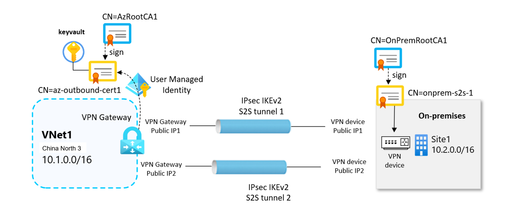 站点到站点证书身份验证依赖于入站和出站证书来建立安全的 VPN 隧道。 证书安全地存储在 Azure Key Vault 中。 每个 VPN 网关通过用户分配的托管标识访问其证书。