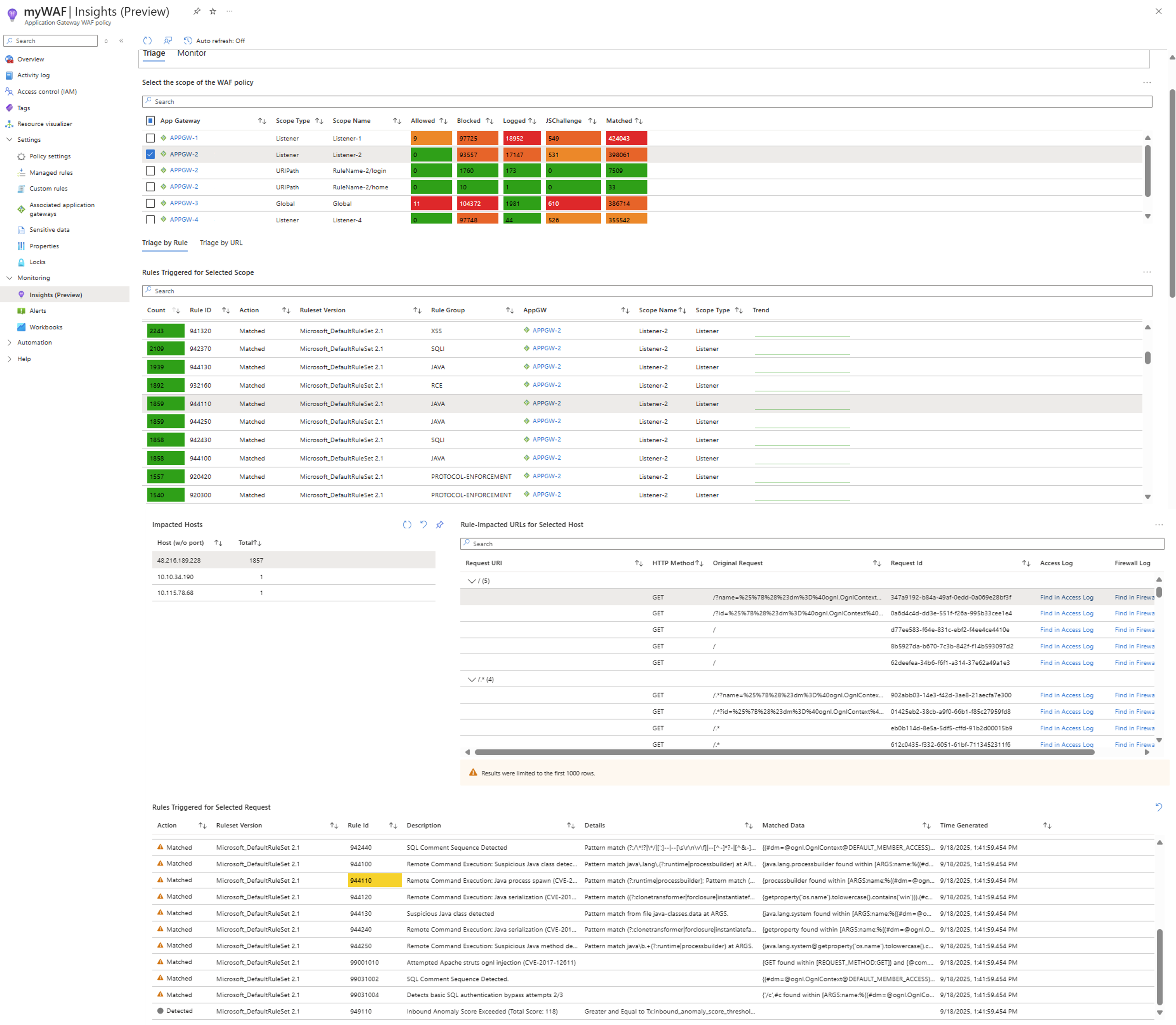 在 “按 URL 分类”中,调查以 URL 路径开头。 分析人员选择相关的应用程序网关和策略范围,确定面向特定 URL 的主机或 IP,并查看这些请求中被触发的规则。 此方法可用于调查敏感终结点上的可疑活动,例如登录页、验证阻止的请求是合法还是恶意,以及跨 URL 映射攻击模式。