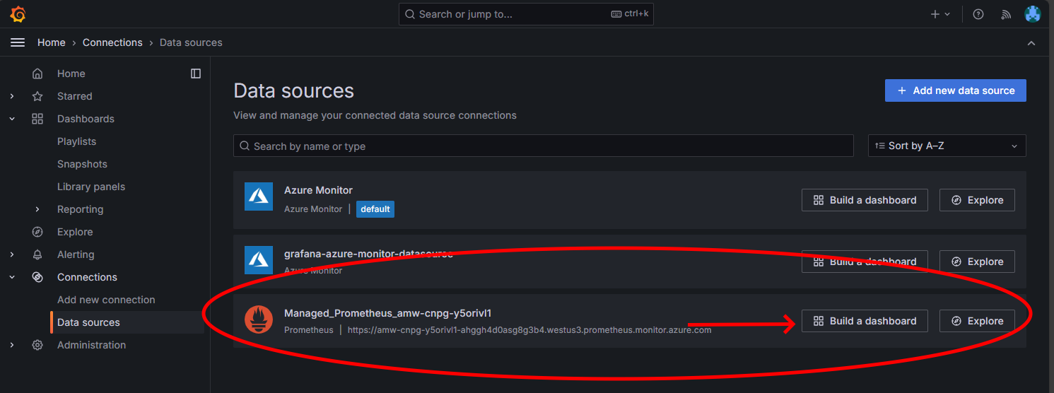选择“终结点”链接将打开一个新的浏览器窗口,你可以在托管 Grafana 实例上创建仪表板。 按照说明配置 Azure Monitor 数据源,然后就可添加可视化效果,创建 Postgres 群集指标仪表板。 设置数据源连接后,从主菜单中选择“数据源”选项。 您应该能看到用于数据源连接的一组数据源选项,正如这里所示。