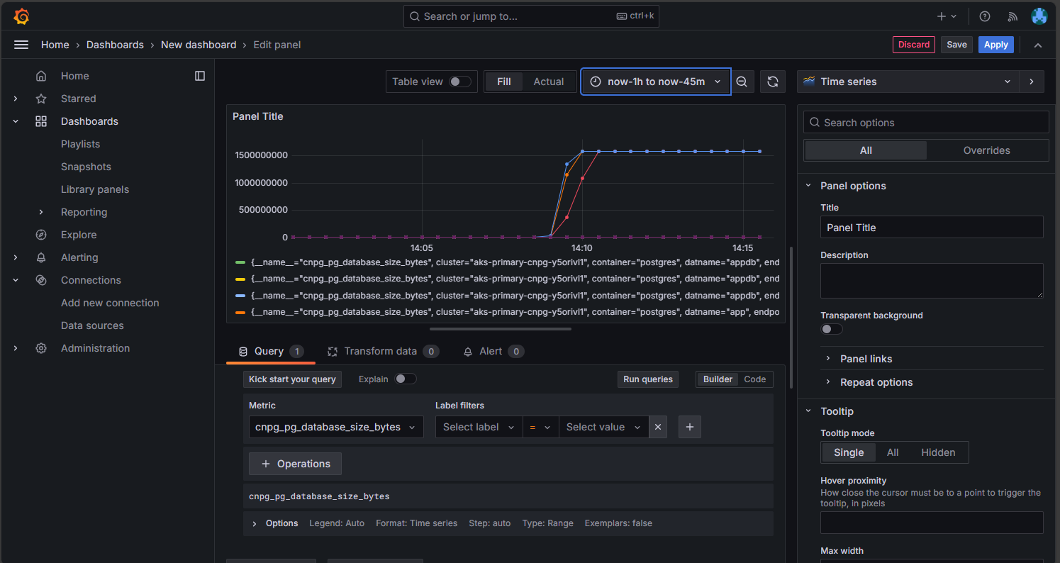 在“托管 Prometheus”选项上,选择“生成仪表板”选项以打开仪表板编辑器。 编辑器窗口打开后,选择“添加可视化效果”选项,然后选择“托管 Prometheus”选项以浏览 Postgres 群集中的指标。 选择要可视化的指标后,选择“运行查询”按钮以提取可视化效果的数据,如下所示: