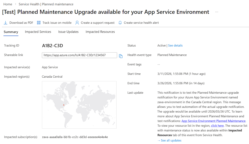 如果将应用服务环境的 升级首选项 设置为 “手动”,可以发送测试升级可用通知。 此测试可帮助你验证自动化逻辑。 测试消息类似于实际通知,但标题以“[Test]”为前缀,说明详细信息不同。