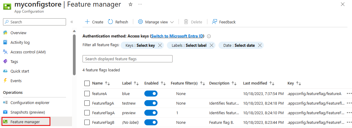 “功能管理器”菜单显示 Azure 应用配置中存储的功能标志。 可通过选择“管理视图”来更改 Azure 门户中的功能管理器显示