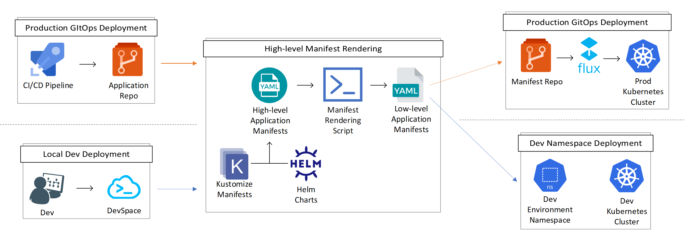 可以使用开发人员本地的配置值在本地为内部开发循环生成类似的低级别清单。 应用程序开发人员可以循环访问代码更改,并使用低级别清单来部署和调试应用程序。 可以使用开发人员的本地配置将低级别清单的生成集成到内部循环工作流中。 大多数内部循环框架都允许通过借助自定义插件进行扩展或基于挂钩注入脚本调用来配置自定义流。