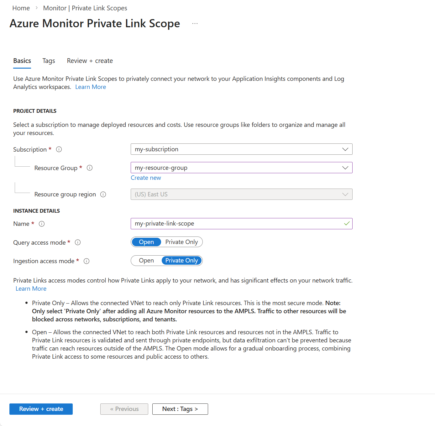 • 名为 "my-scope" 的 AMPLS,其查询和引入访问模式设置为 Open