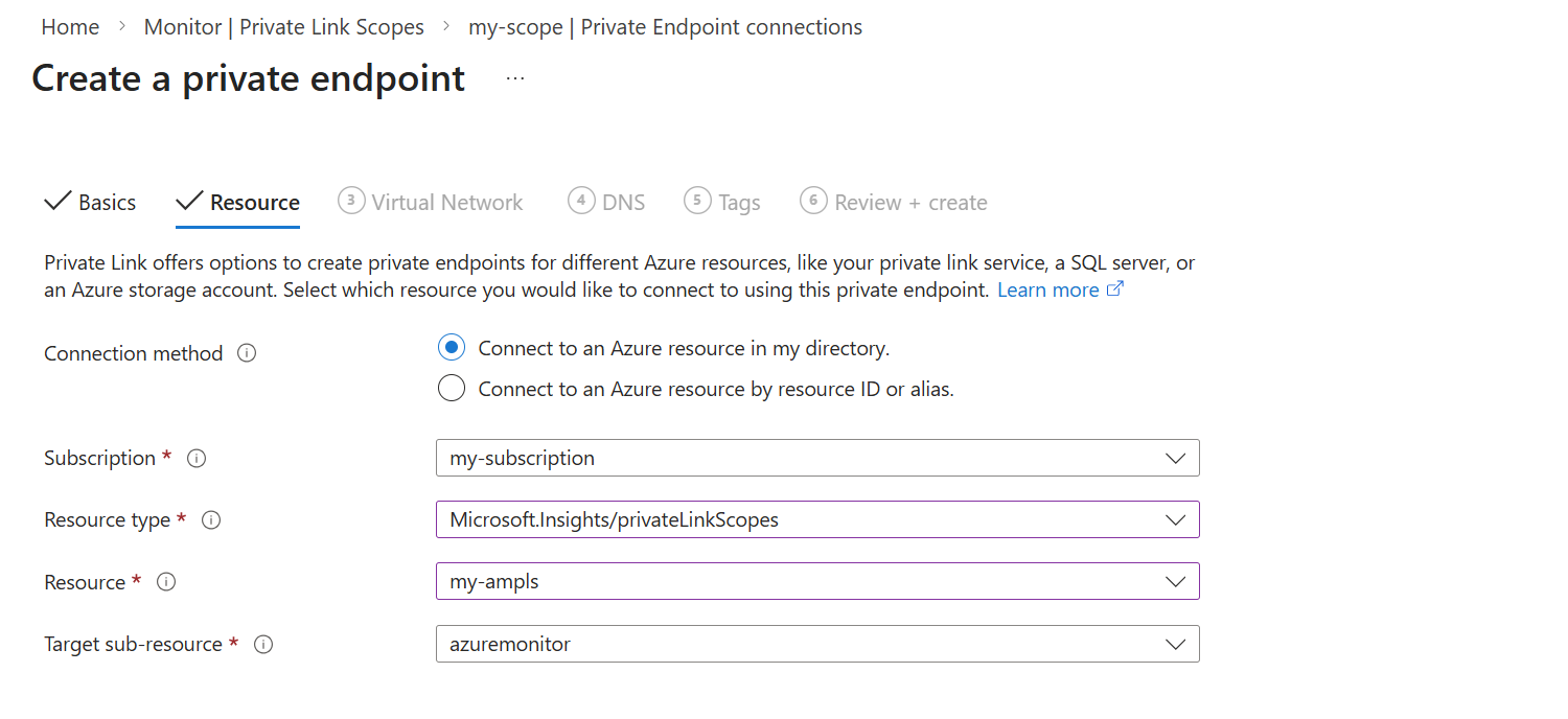 您可以从文本框中选择资源,或选择 通过资源 ID 或别名连接到 Azure 资源,并粘贴 AMPLS 资源的 ID。