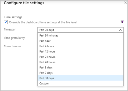 默认情况下,仪表板磁贴上的时间跨度/时间范围设置为 24 小时。若要更改,请单击右上角的省略号,选择“自定义磁贴数据”,检查“在标题级别替代仪表板时间设置”框,然后使用下拉菜单选择时间跨度。