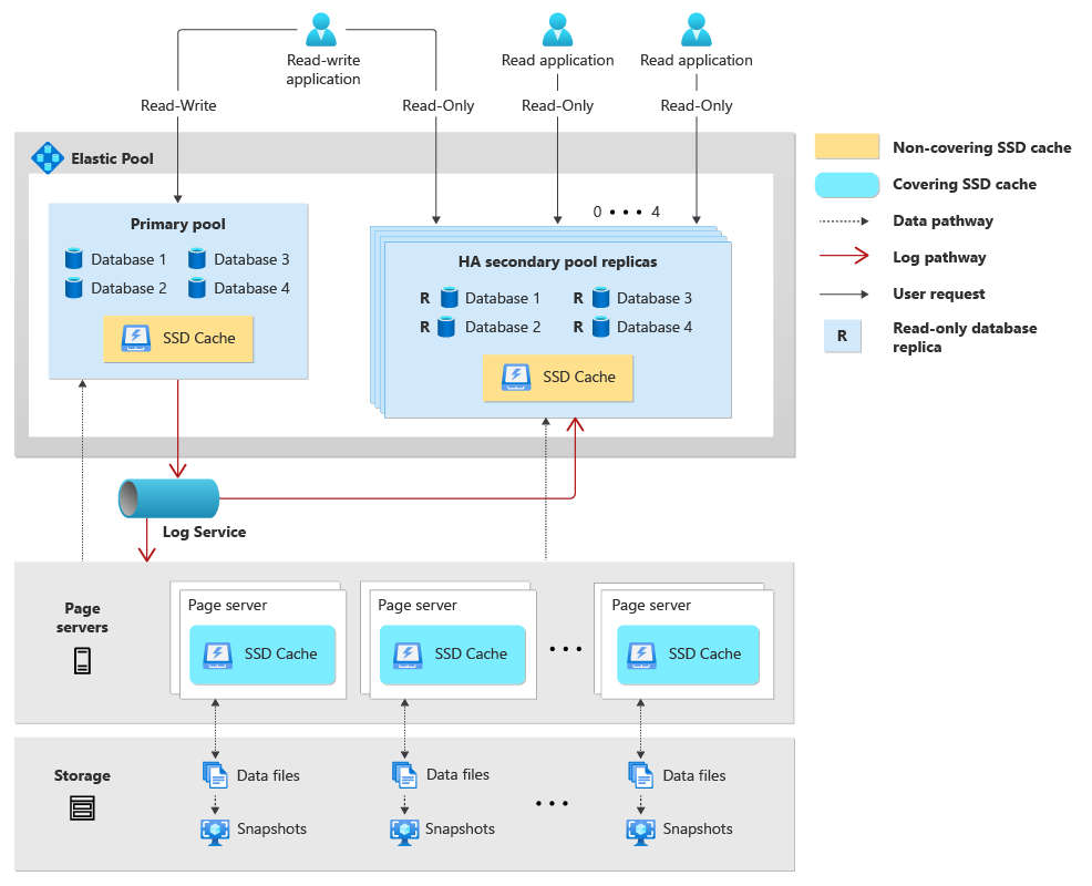 • 主弹性池中的超大规模数据库都共享同一个日志服务。 由于高可用性池中的数据库没有写入工作负载,因此它们不利用日志服务。