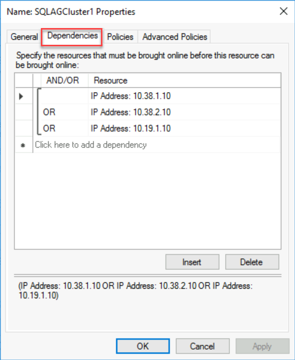 再次打开 “群集属性 ”对话框,然后选择“ 依赖项 ”选项卡。为两个