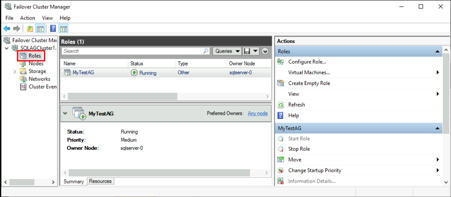 a. 在“故障转移群集管理器”中,单击“角色”,然后单击可用性组