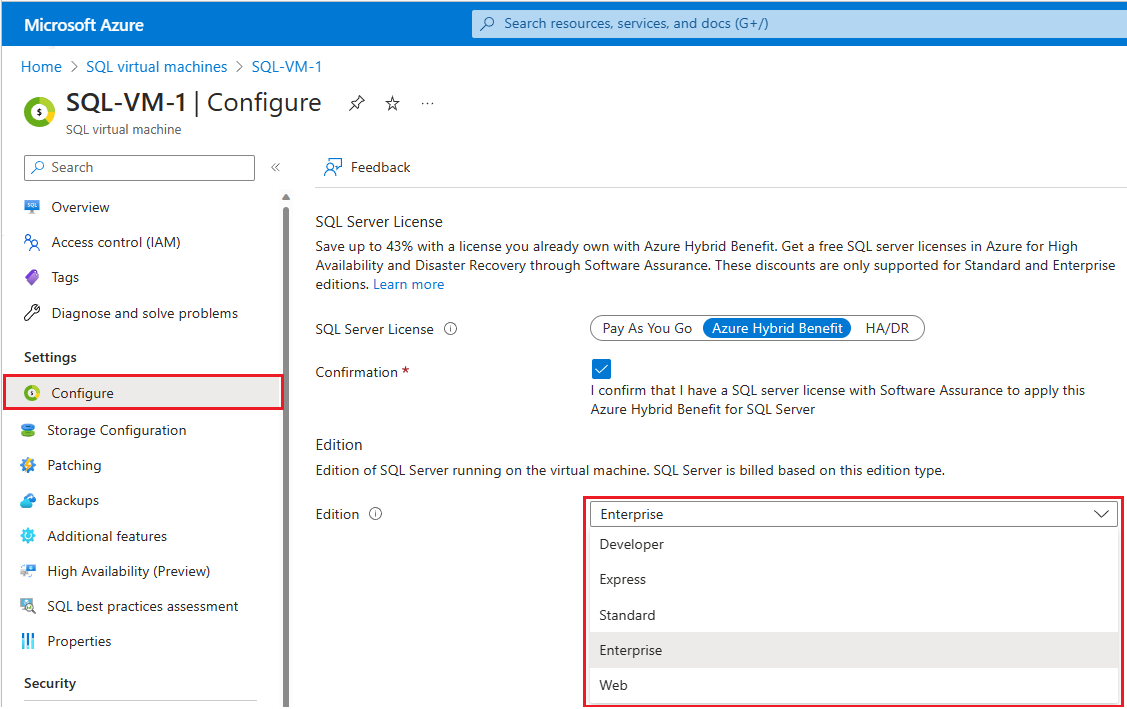 - 在 VM 上更新 SQL Server 后,确保 Azure 门户中 SQL Server 的“版次”属性与计费的已安装版次编号匹配。