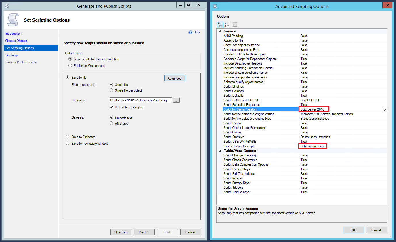 如果较低版本中没有用于重建用户数据库的脚本,则必须使用 BCP.exe、SSIS 或 DACPAC 为所有对象编写脚本并导出所有数据。