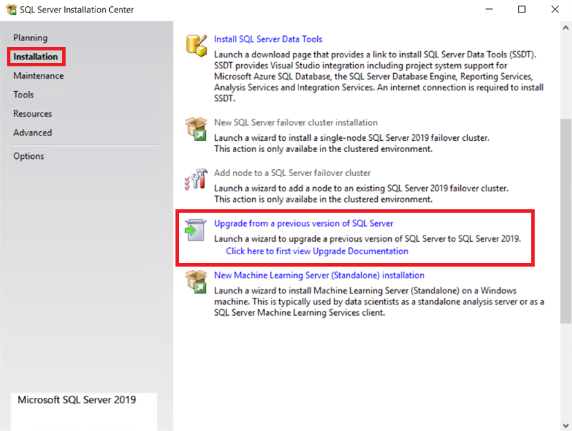Setup.exe。安装向导将运行 SQL Server 安装中心。 若要升级 SQL Server 的现有实例,请在导航窗格中选择 “安装 ”,然后选择 “从早期版本的 SQL Server 升级”。